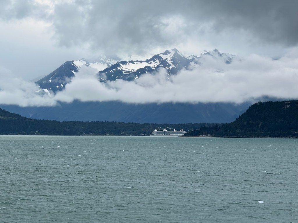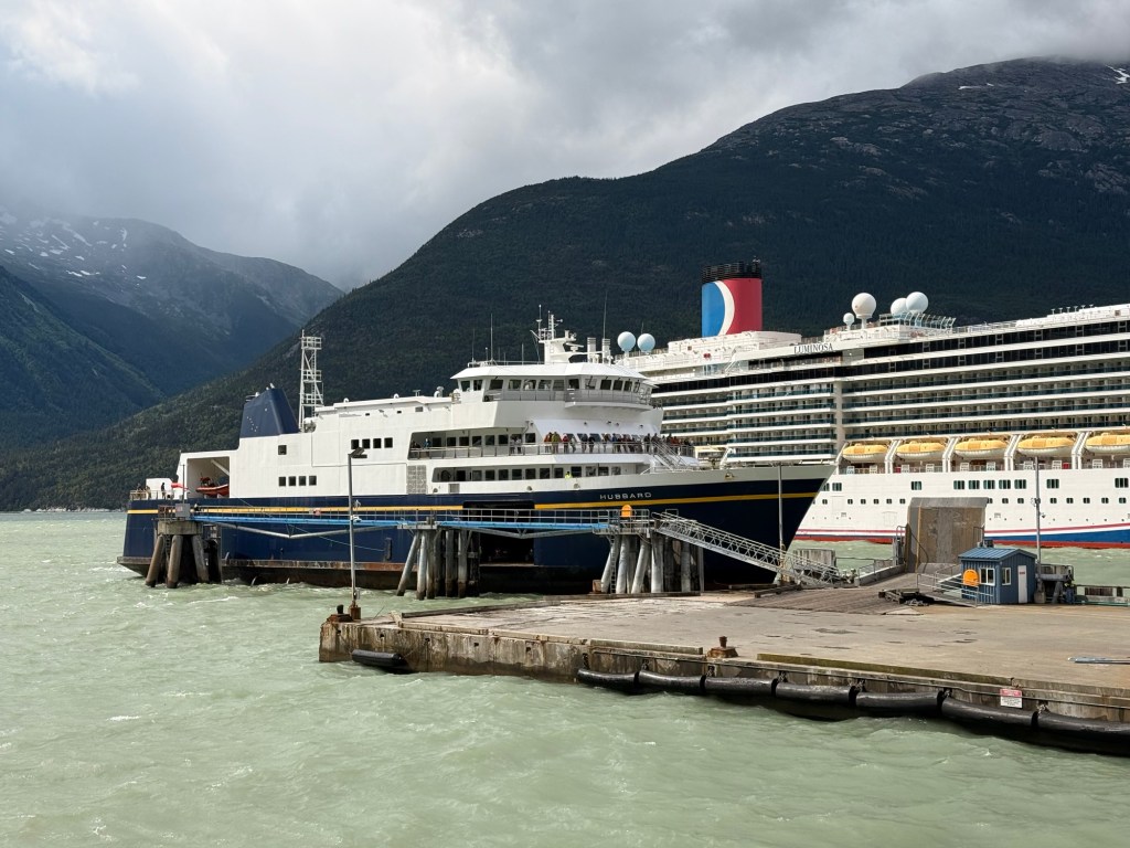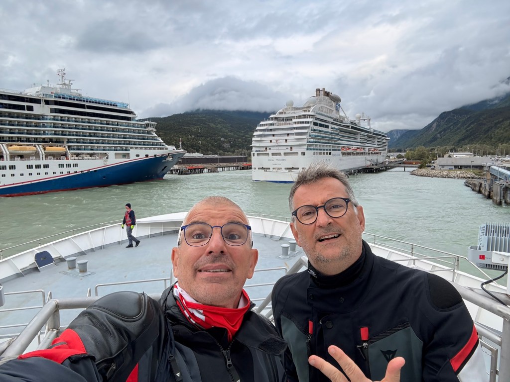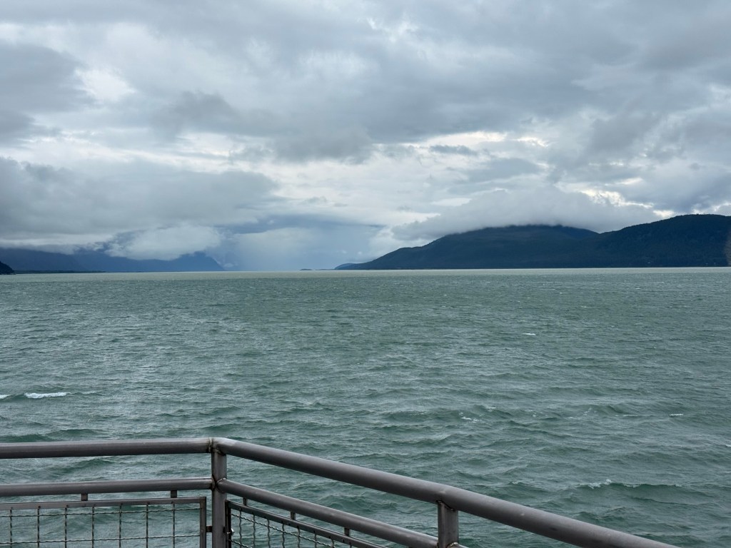 Il était prévu de faire la traversée à 14 h 45, mais nous avons finalement embarqué à 15 h à bord de l’Alaska Marine Highway pour traverser le Lynn Canal et rejoindre Haines. L’embarquement a pris plus de temps que prévu : devant nous, une file impressionnante de grands camping-cars et de pickups tractant d’énormes caravanes. Les voir manœuvrer en marche arrière dans la cale du bateau relevait de l’exploit et demandait une sacrée expérience de conduite.