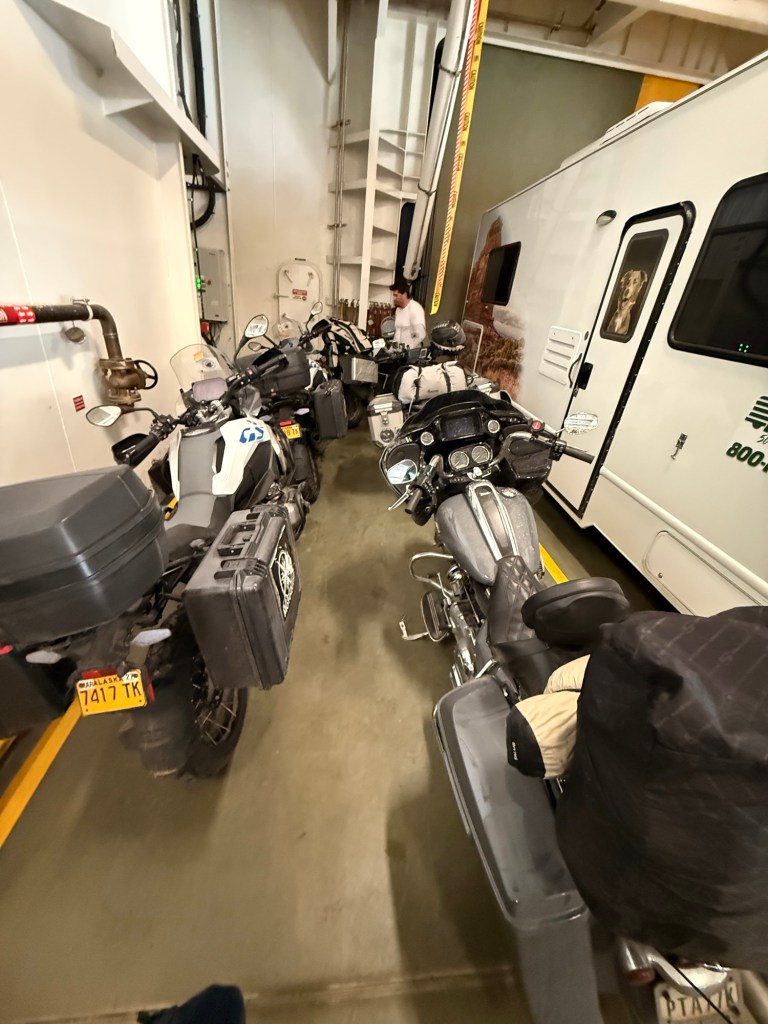 À bord, nous n’étions pas les seuls motards : huit motards au total, dont trois Canadiens, deux Brésiliens, un Américain… et nous. Une belle occasion d’échanger sur nos parcours respectifs, partager nos coups de cœur et cette passion commune pour la route et l’aventure.
