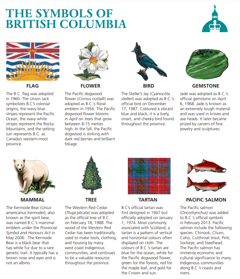 The B.C. flag was adopted in 1960. The Union Jack symbolizes B.C’s colonial origins, the wavy blue stripes represent the Pacific Ocean, the wavy white stripes represent the Rocky Mountains, and the setting sun represents B.C. as Canada’s western-most province.