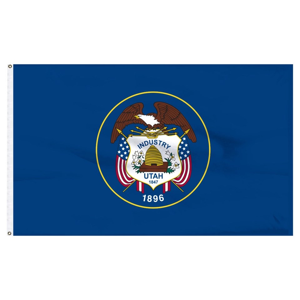 The state flag of Utah features the seal of the state. There are several different elements to the seal. A bald eagle, the national bird, is included in the seal to symbolize protection during war and peace. The state flower, the sego lily, is also included and is a symbol of peace. The beehive represents progress of the state and hard work. The state’s motto “Industry” is also written on the seal, as well as the state’s name, and the date 1847, which is the year that Mormon pioneers came to the state. Underneath the design is the date 1896, which is the year that Utah was admitted to the Union.